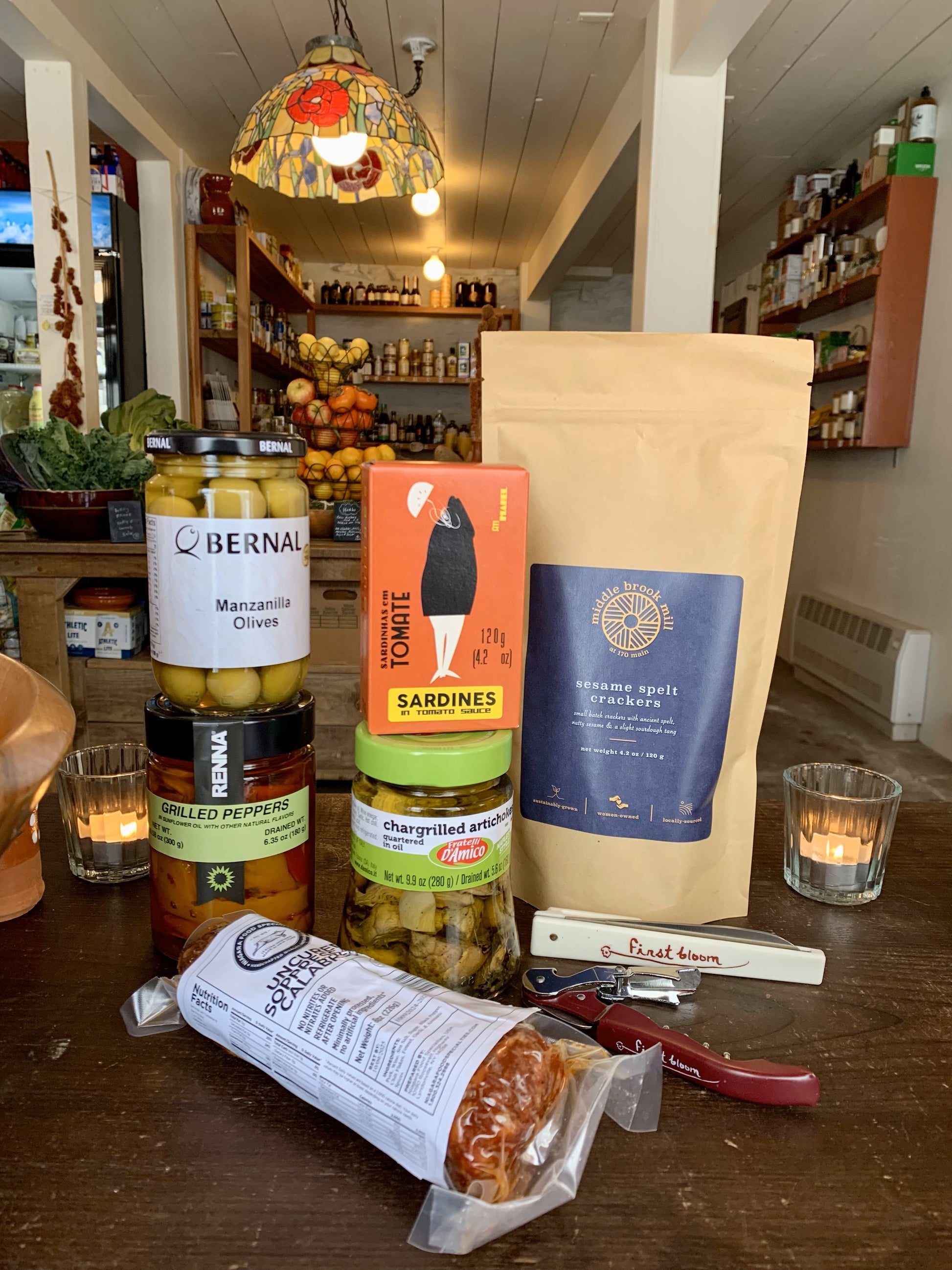Everything you need for an impromptu Apero Hour. Each box is unique, but expect things that are briny and jarred, meaty and cured, fishy and tinned and our favorite crackers, of course. Each box will also come with a First Bloom wine key and folding knife (which are hard to come by!). Photo is illustrative.