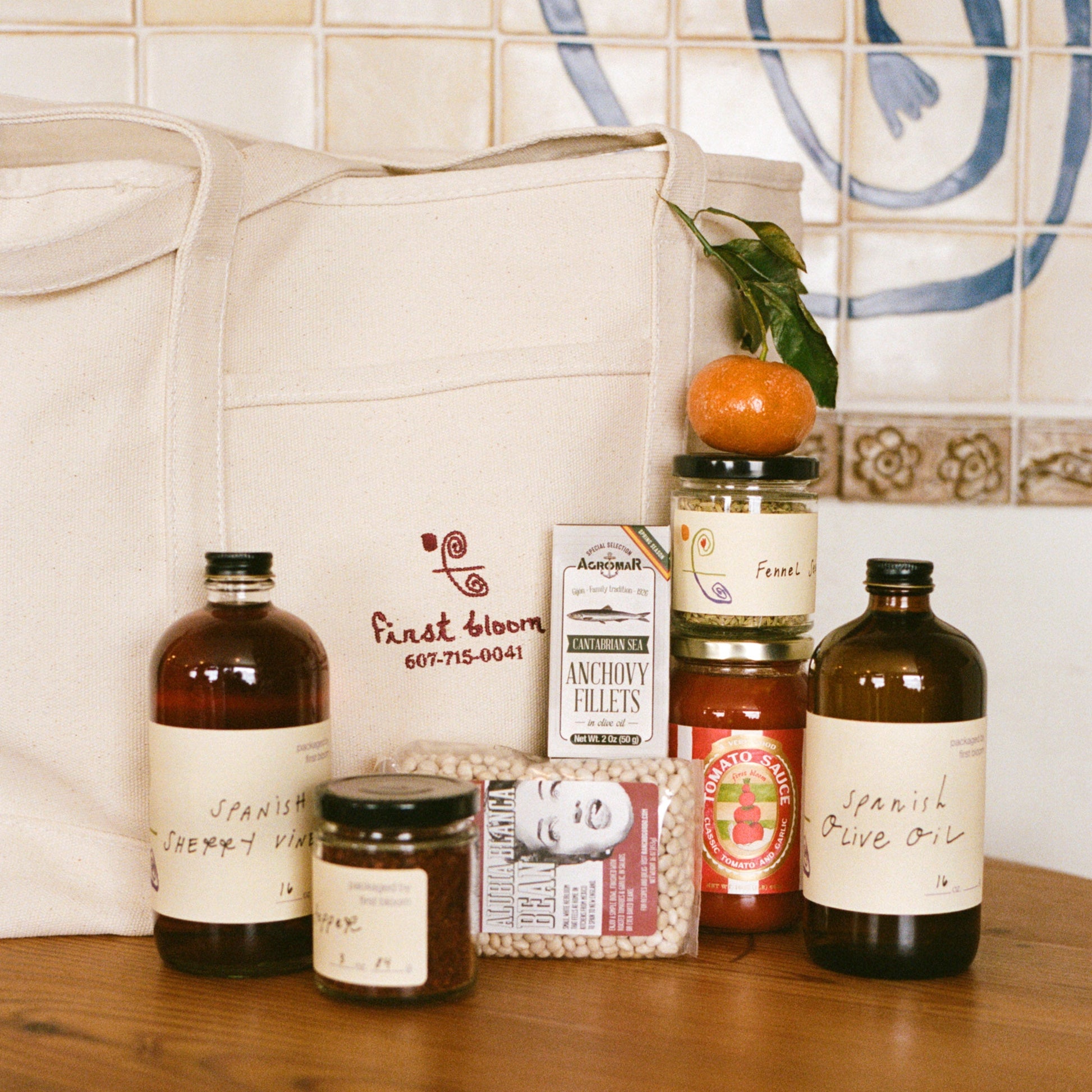 For when you can’t make it to the shop, all our must have First Bloom essentials in one box. Expect our Spanish olive oil, sherry vinegar, most used spices (Aleppo pepper and fennel seed), a jar of Very Good Tomato Sauce (Classic Tomato & Garlic), anchovies and a bag of our favorite Rancho Gordo beans du jour. And, for your next trip to the market, there’s the option to add the sturdiest, largest, most functional canvas tote on the market embroidered with our logo and phone number so you can call us anytime.