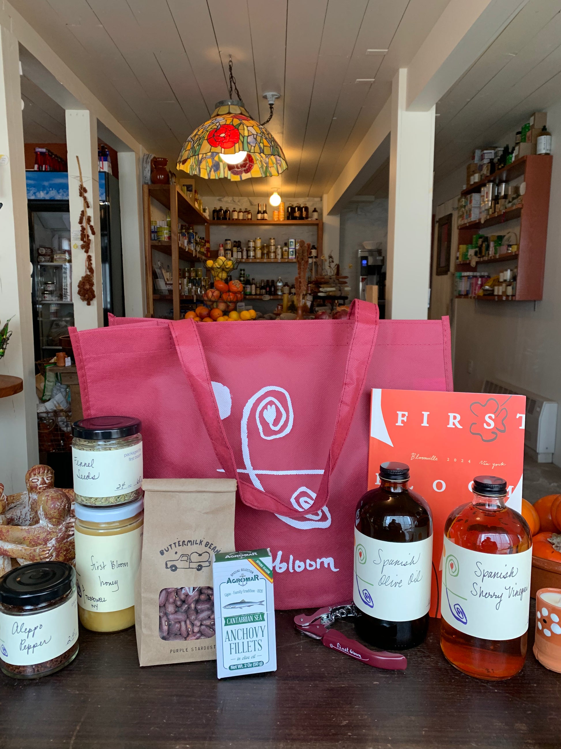 Like a trip to the shop! All of our favorite First Bloom essentials in one box. Expect our Spanish olive oil, sherry vinegar, favorite spices, good anchovies, and a few other surprises. Each box also comes with a First Bloom tote, wine key, and our first mini-book full of recipes and ideas for your pantry staples: First Bloom, Volume 1. Photo is illustrative.