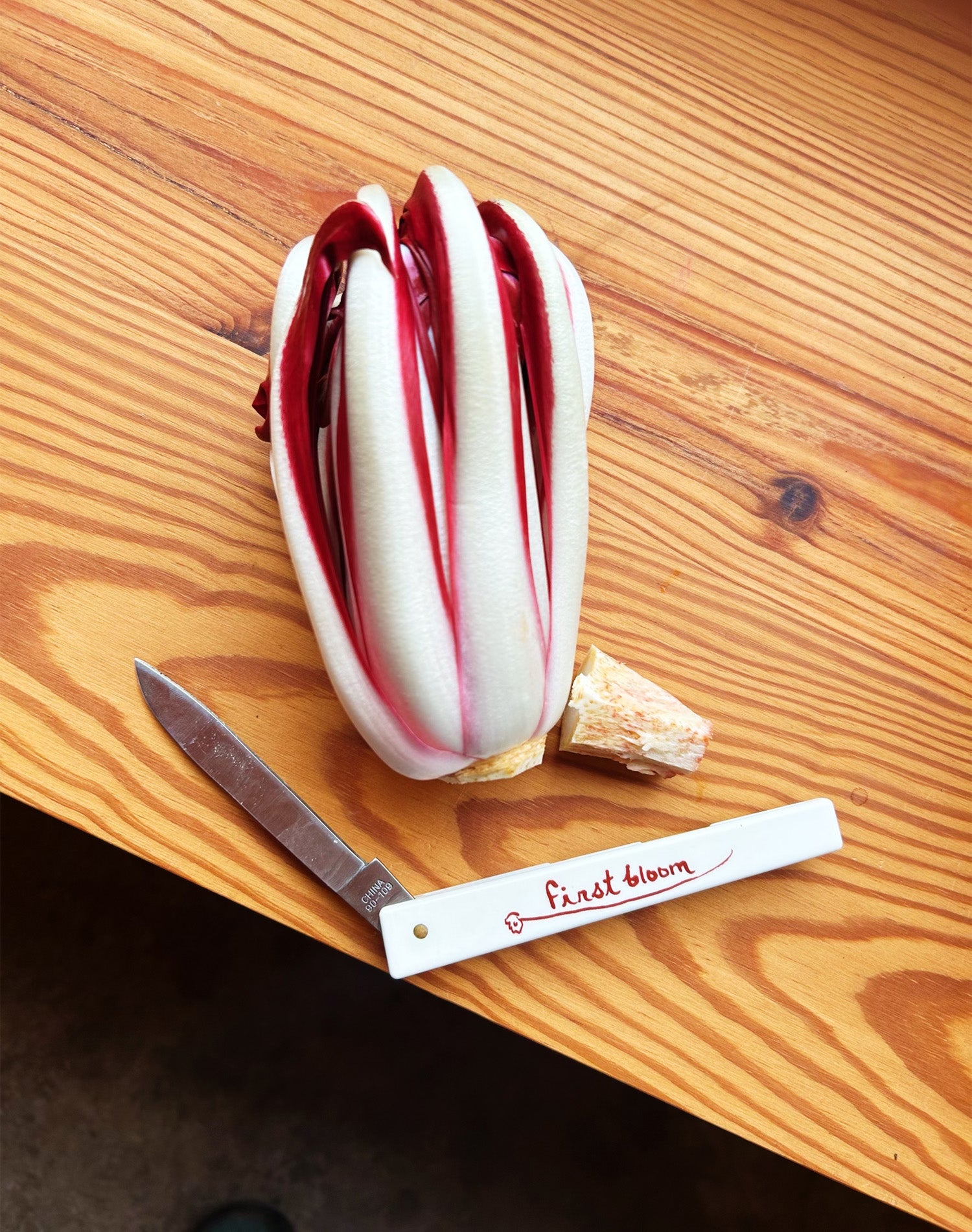 Ever wanted to cut an apple while you were on a hike or in the car but didn't have a knife? Well...this is that knife. Folds, is cute, sharp but not too sharp. Good for cheese, too. Cream with First Bloom in red script and a long flower. Clip on back (for easy access). 5" handle 4" blade.