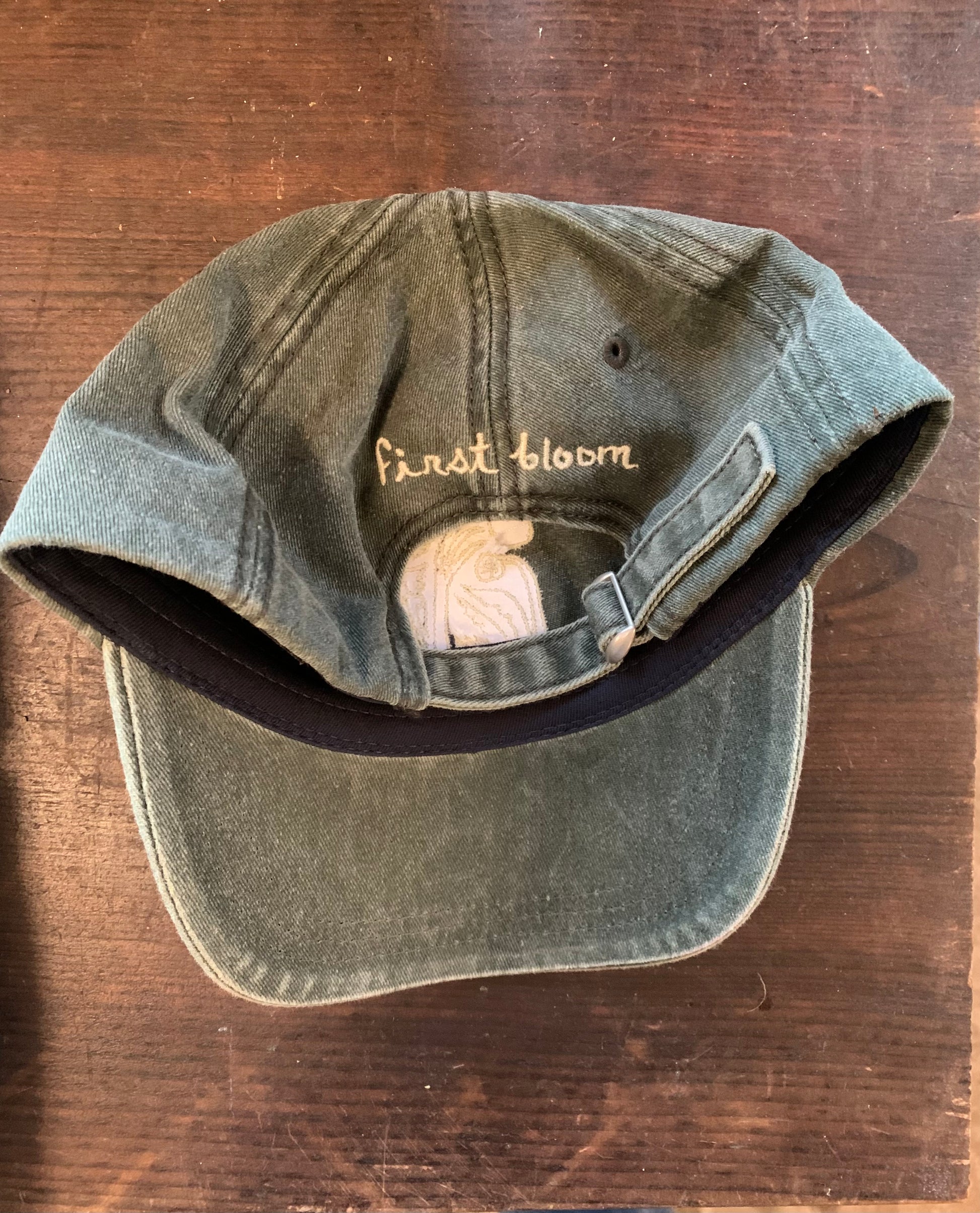 Displays abstract floral design on front. First Bloom in white script on reverse. Adjustable strap at back with brass closure. Hats will ship out beginning 12/12.