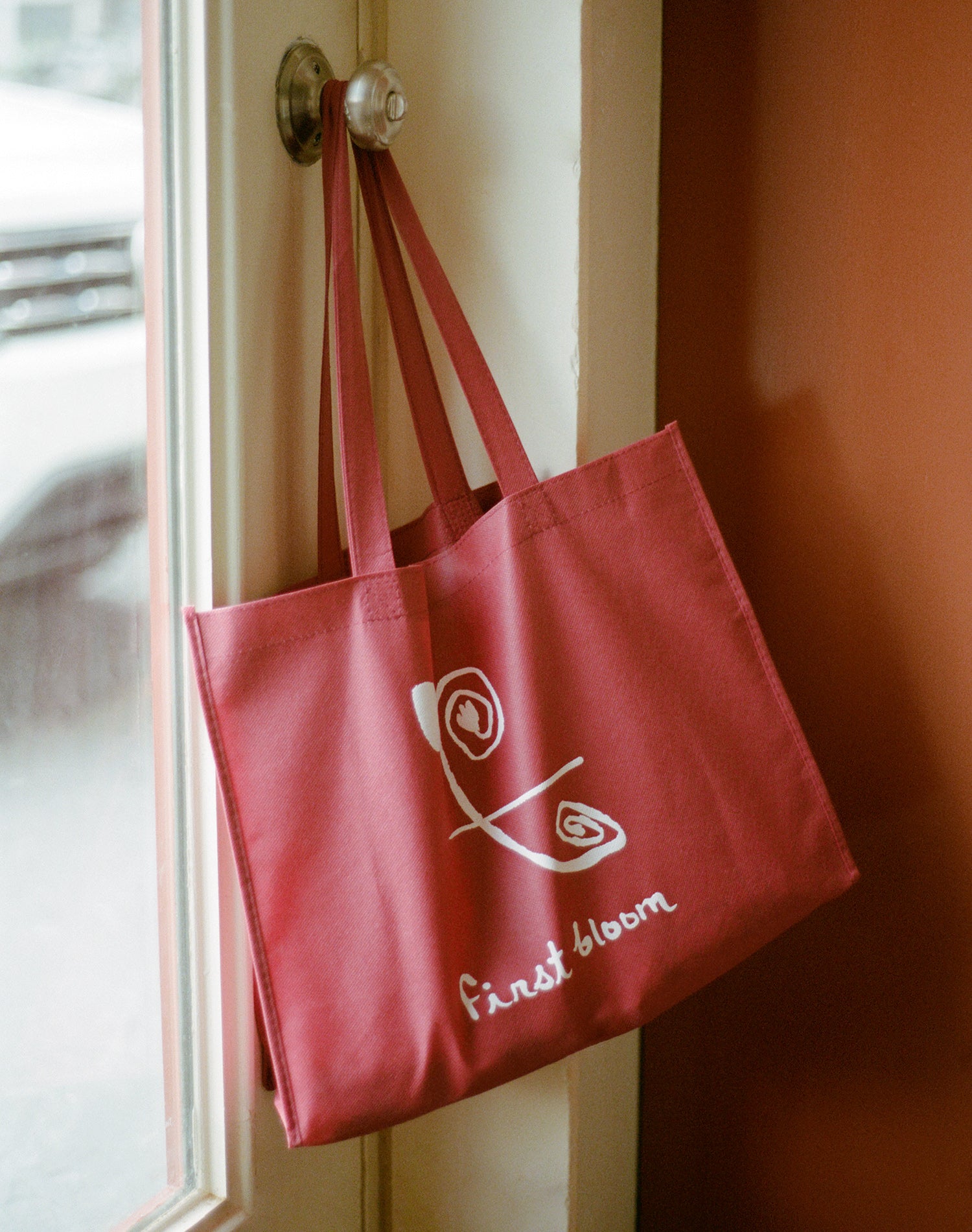 Maroon, lightweight non-woven material with mid length handles, white First Bloom logo printed on each side.